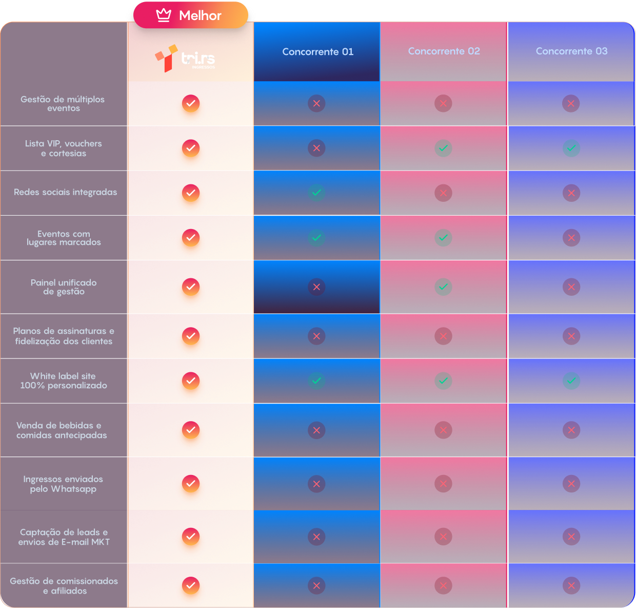 A TRI.RS reúne todas as ferramentas que um produtor precisa em um único lugar: vendas online, gestão de ingressos, check-in, relatórios em tempo real, campanhas de marketing e integrações com diverso canais.